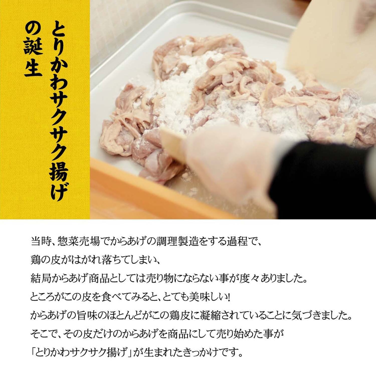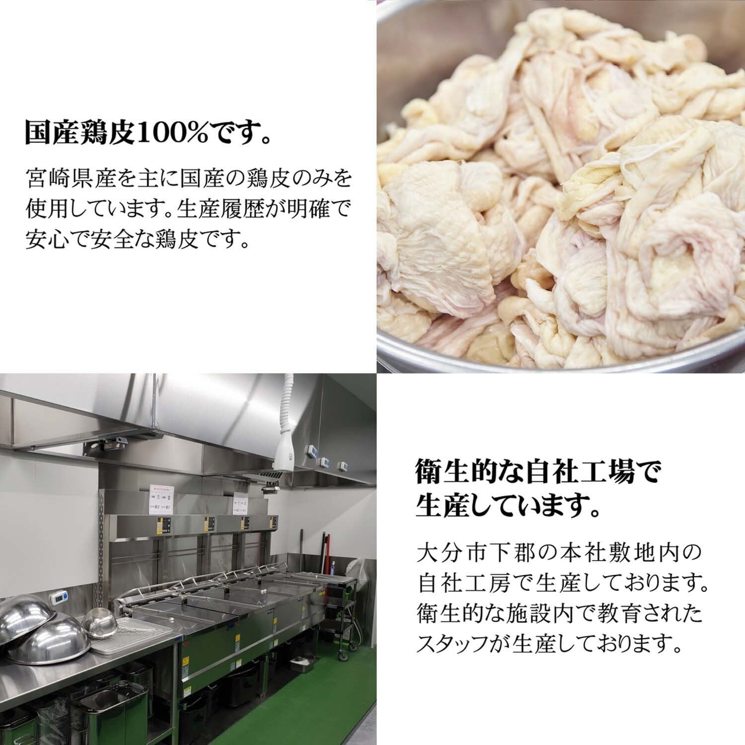 ◉原材料名:鶏皮(国産)、米油、デンプン、上用粉、鶏ガラスープ、塩、酵母エキス、ホワイトペッパー