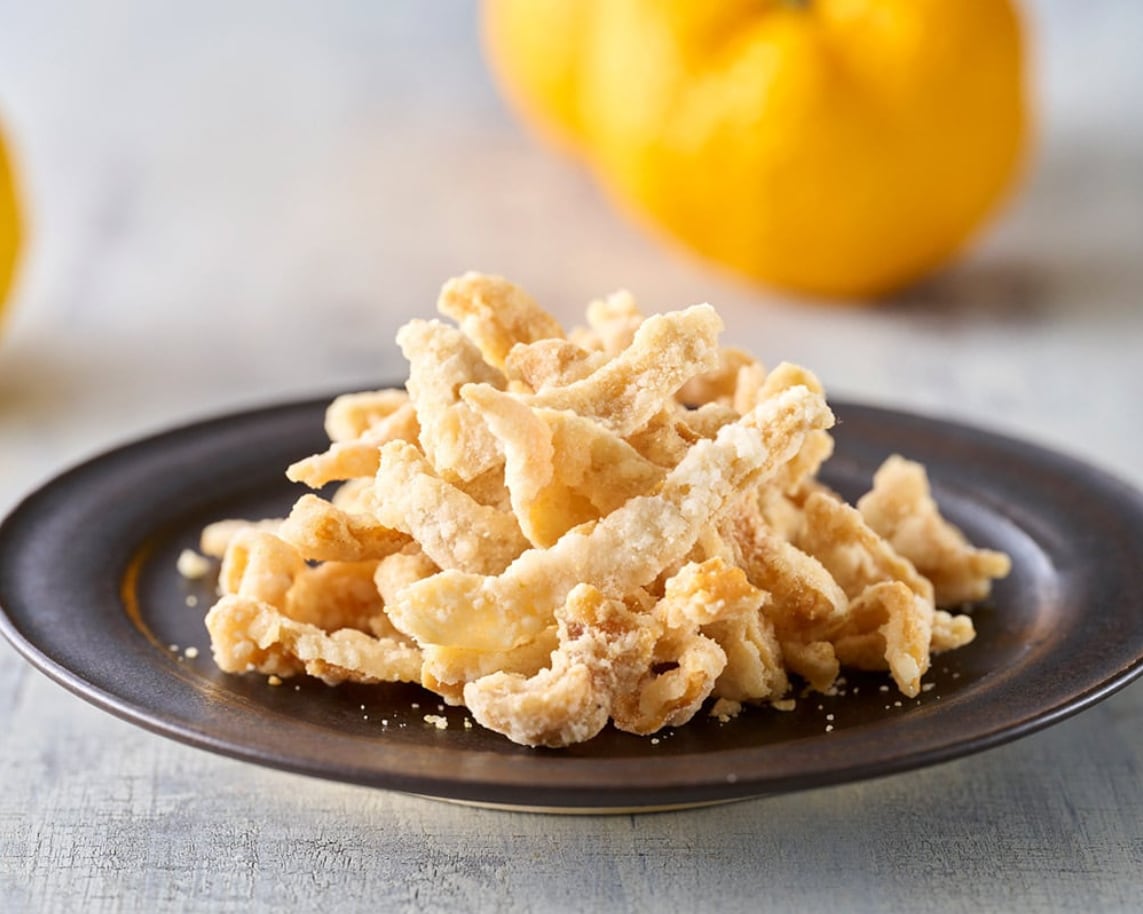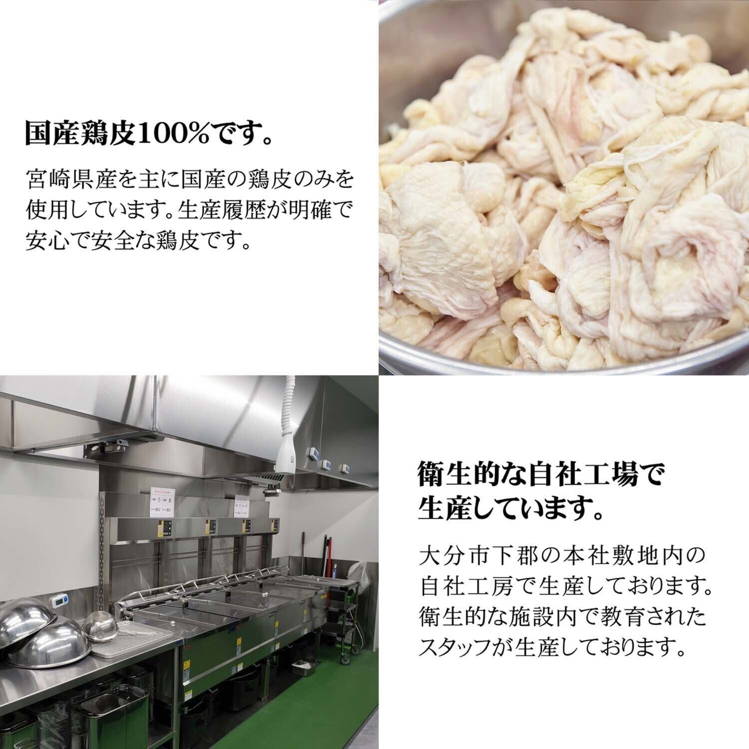 ◉原材料名:鶏皮(国産)、米油、デンプン、上用粉、ゆずこしょうパウダー、鶏ガラスープ、塩、酵母エキス、ホワイトペッパー
